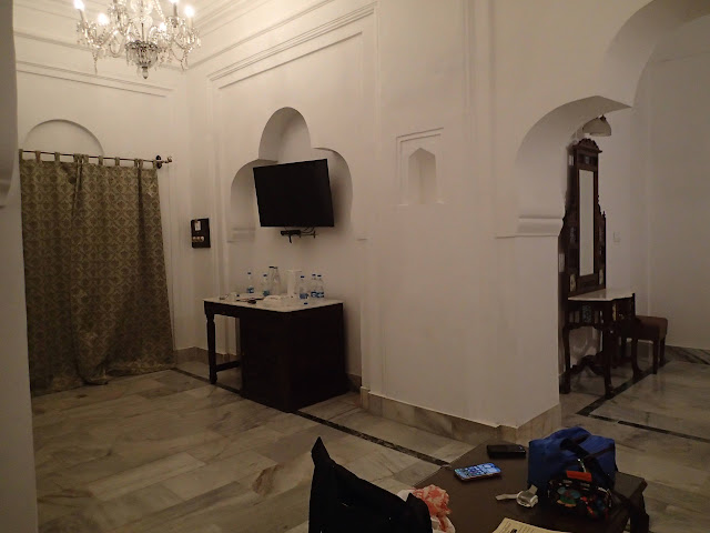 いきなり良い雰囲気です。正面の建物の入り口を入ると直ぐにレセプションです。レセプションから入ってきた門を見たところレセプションのドアノブ、凝ってます。ファミリーツリーがありました。最近は「親ガチャ」なんて言われているけれど、一番下の男の子、ここに生まれて幸せですね。ツインのお部屋で真ん中に応接セットがある広~~いお部屋奥はバスルーム、シャワーのお湯も問題なく、スーツケースもゆったり置けてグー👍wifiがレセプションしか通じないので、お部屋ではモバイルwifiが活躍!ベッドの横にあったこの機械は暖房機です。インドのエアコンには暖房機能がなく別なんです。ちゃんと動きました。宮殿ホテルの鍵はどこも南京錠でした。重いしカチャッてはまらないし、いつも二人がかり😅内側からの鍵はかんぬき錠。前回のホテルではメンテナンスの係の人に教えてもらってやっとわかった。鍵がないと思っていた人もいたぐらいです😮 今回もこんな上にあった・・・鍵ってドアノブの辺りで探してしまって上に目がいかないのです。晩御飯の前にホテルの中を散策していたら、ホテルの人らしきお兄ちゃんが良い景色はこっちこっちと屋上まで連れて来られた~本当に良い景色でした。中庭も見えました。私達のお部屋はこの中庭から行きます。このホテルってこんなに大きかったんだ~